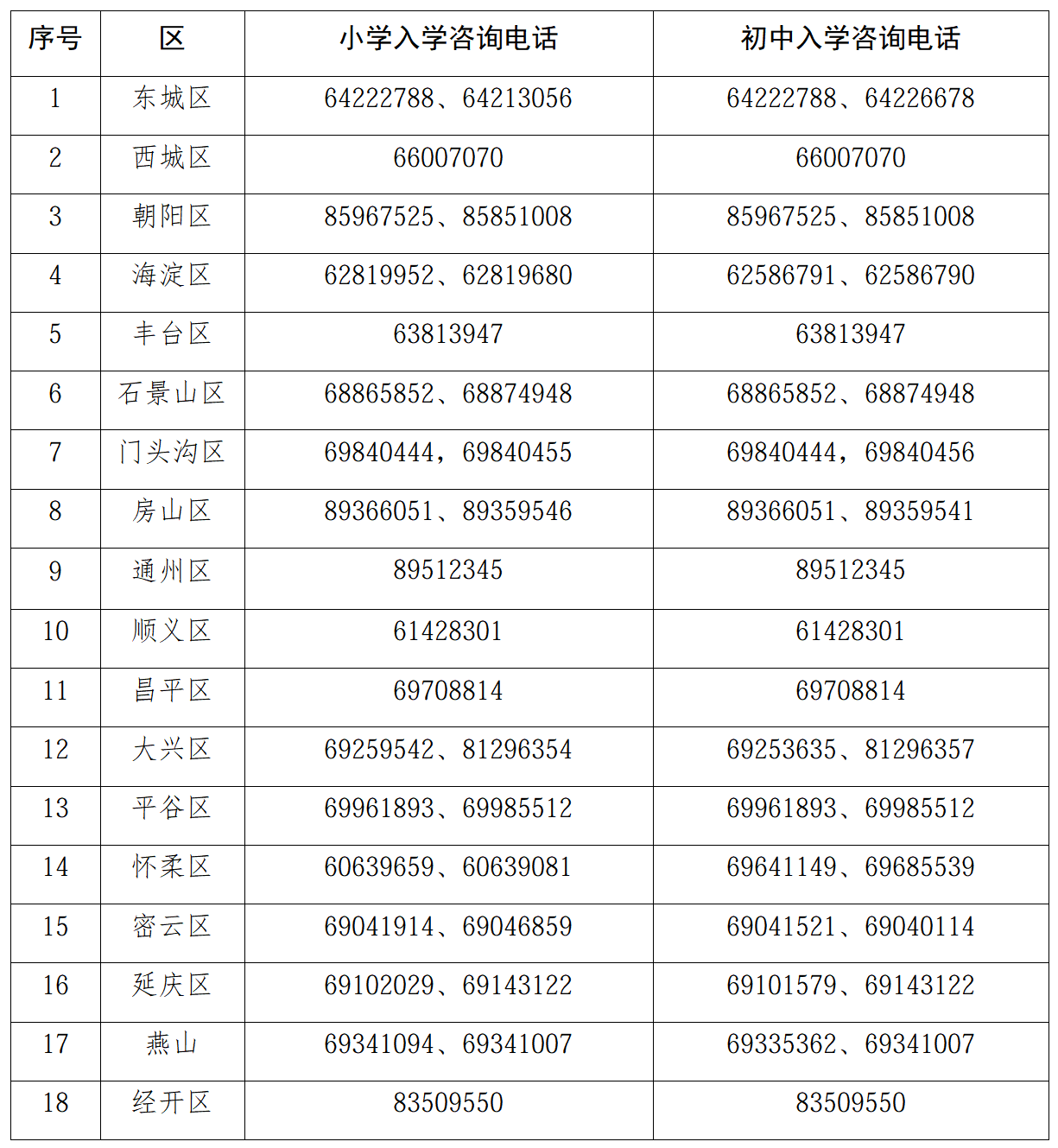 各区义务教育阶段入学工作咨询电话